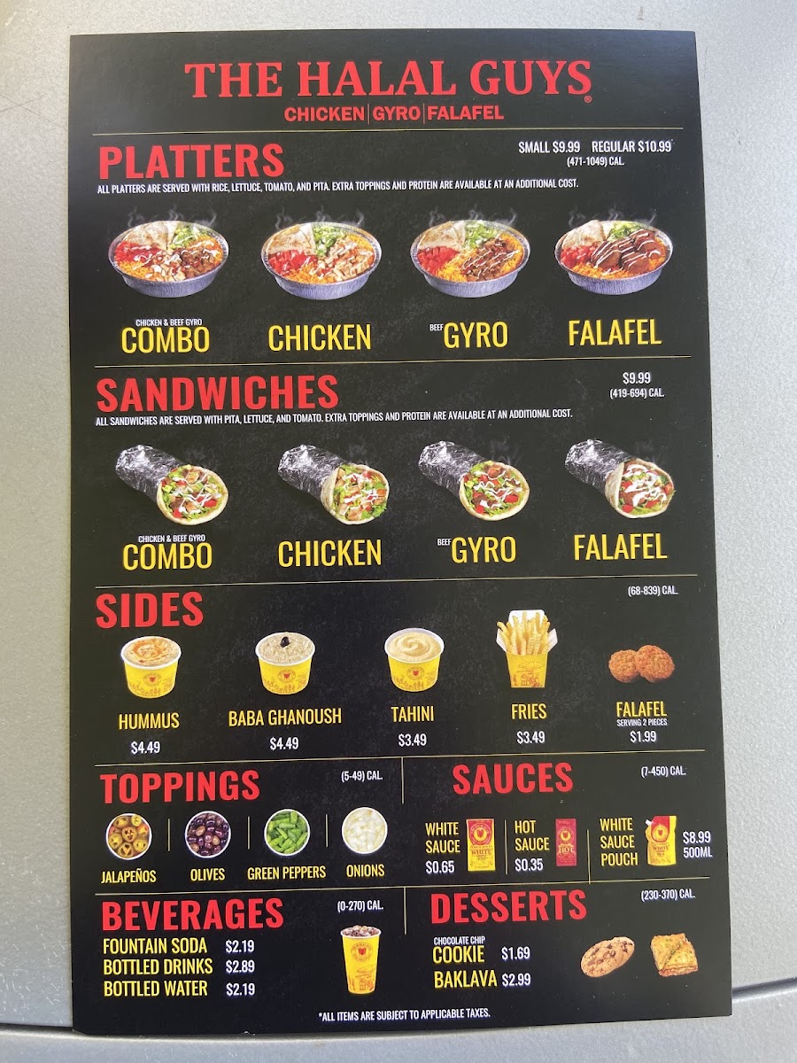 From a reviewer’s perspective, the menu at The Halal Guys offers a familiar yet satisfying range of options that balance indulgence and simplicity. The core appeal lies in the hearty Sandwich, Small Platter, and Regular Platter, which deliver the brand’s signature flavors, while the Family Meal Deal is a convenient choice for groups. The “Limited Time Only” section adds variety with items like the Small Chicken Wings Platter, Regular Chicken Wings Platter, and Chicken Wings, giving regulars something new to try. Sides such as Jalapeños, 4 - Pieces Falafel, Rice, White Sauce Pouch, and Hummus complement the mains well, enhancing both texture and flavor. On the sweeter side, desserts like Baklava Cheesecake, Baklava, and Chocolate Baklava Cheesecake provide a rich, satisfying finish. Beverage selections are straightforward, including Sprite, Ginger Ale, and Diet Coke, alongside more distinctive craft drinks like Strawberry Lemonade, Mango Iced Tea, Passion Fruit Lemonade, Lychee Iced Tea, and Mint Lemonade, which add a refreshing twist. Overall, the menu is concise but well-rounded, focusing on crowd-pleasing staples with just enough variety to keep things interesting.